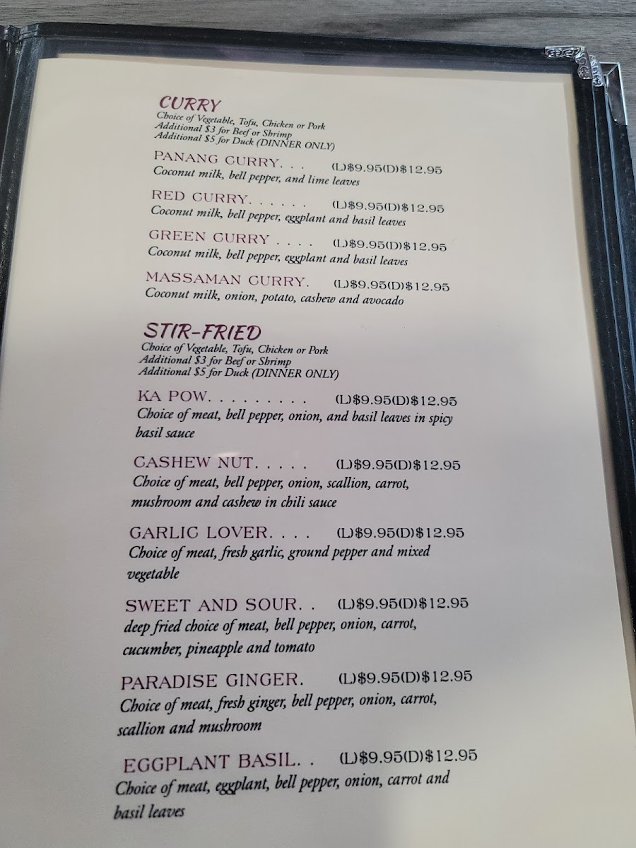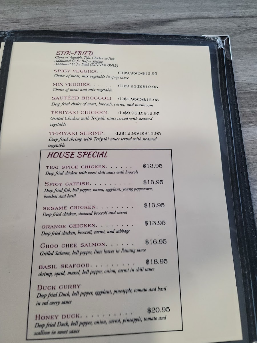 stir fried wilh fresh basil leaves, bell peppers, carrots, and onion with chef special sauce